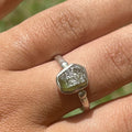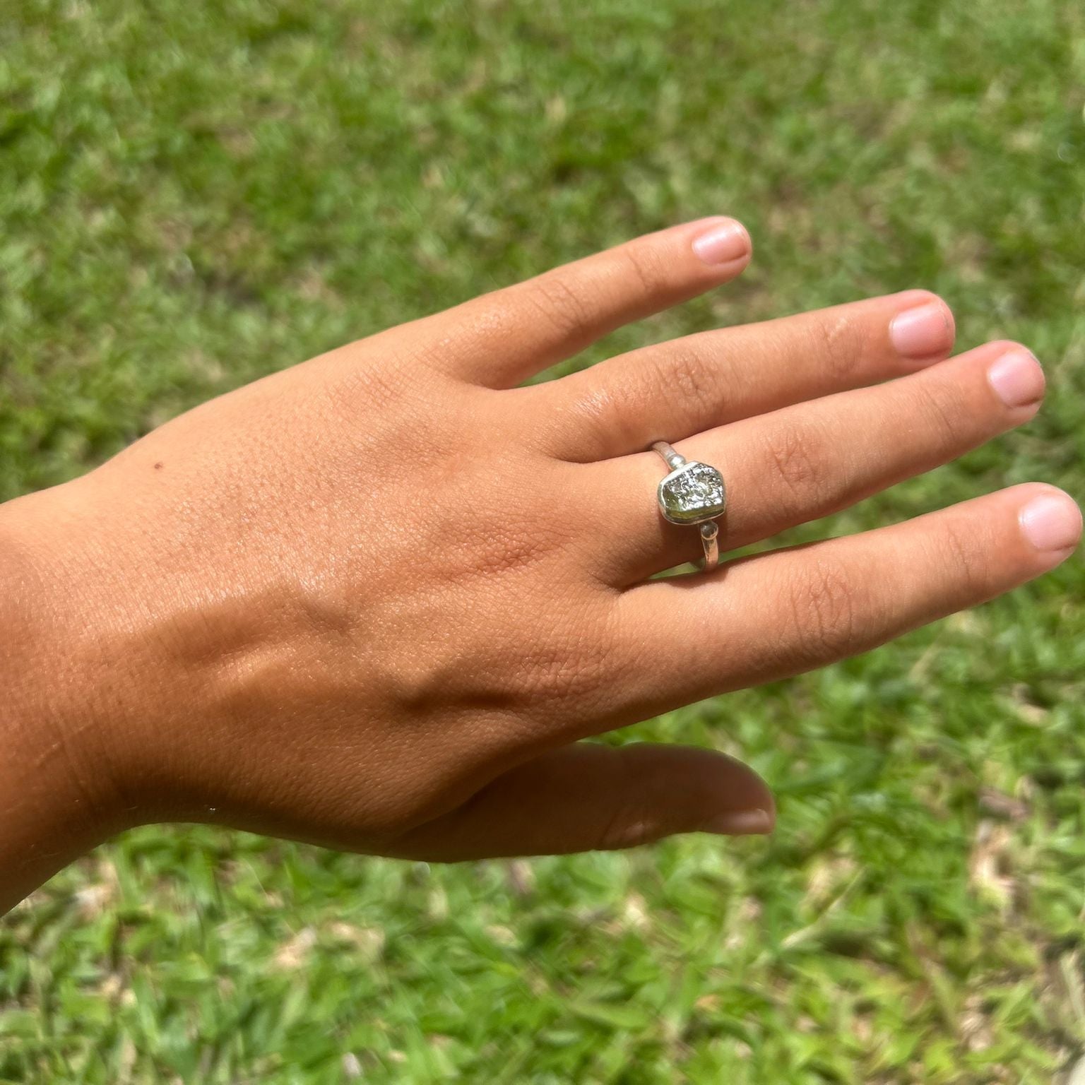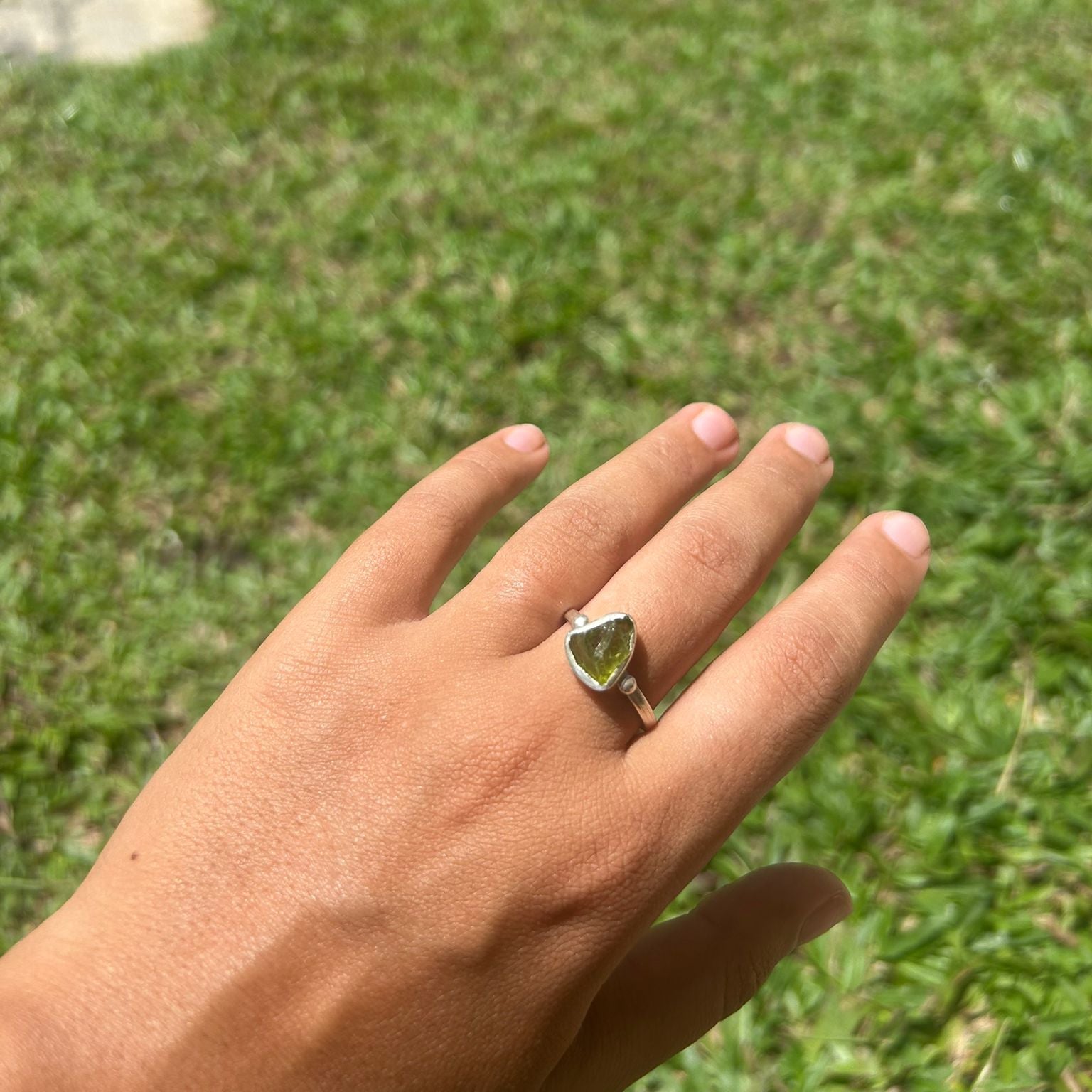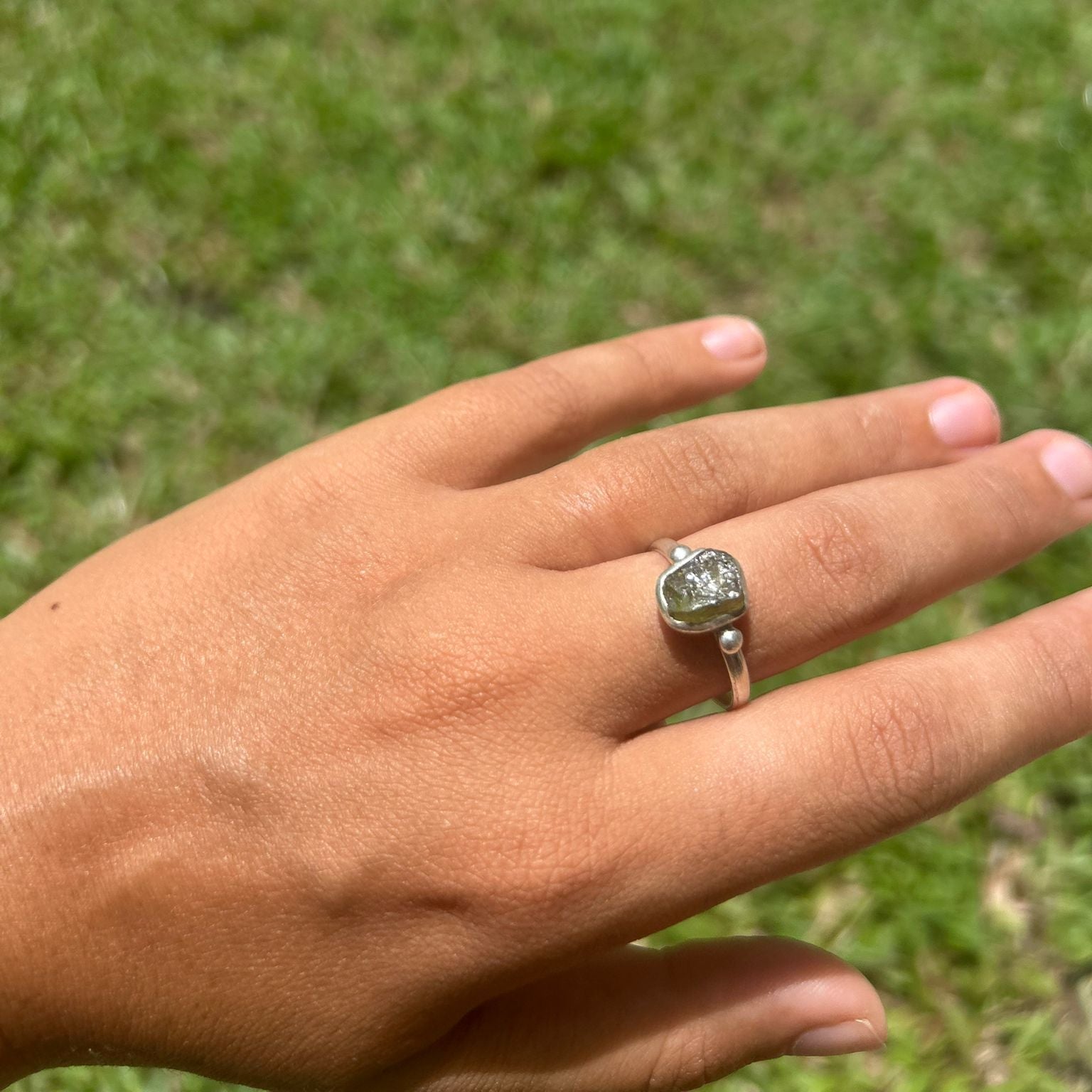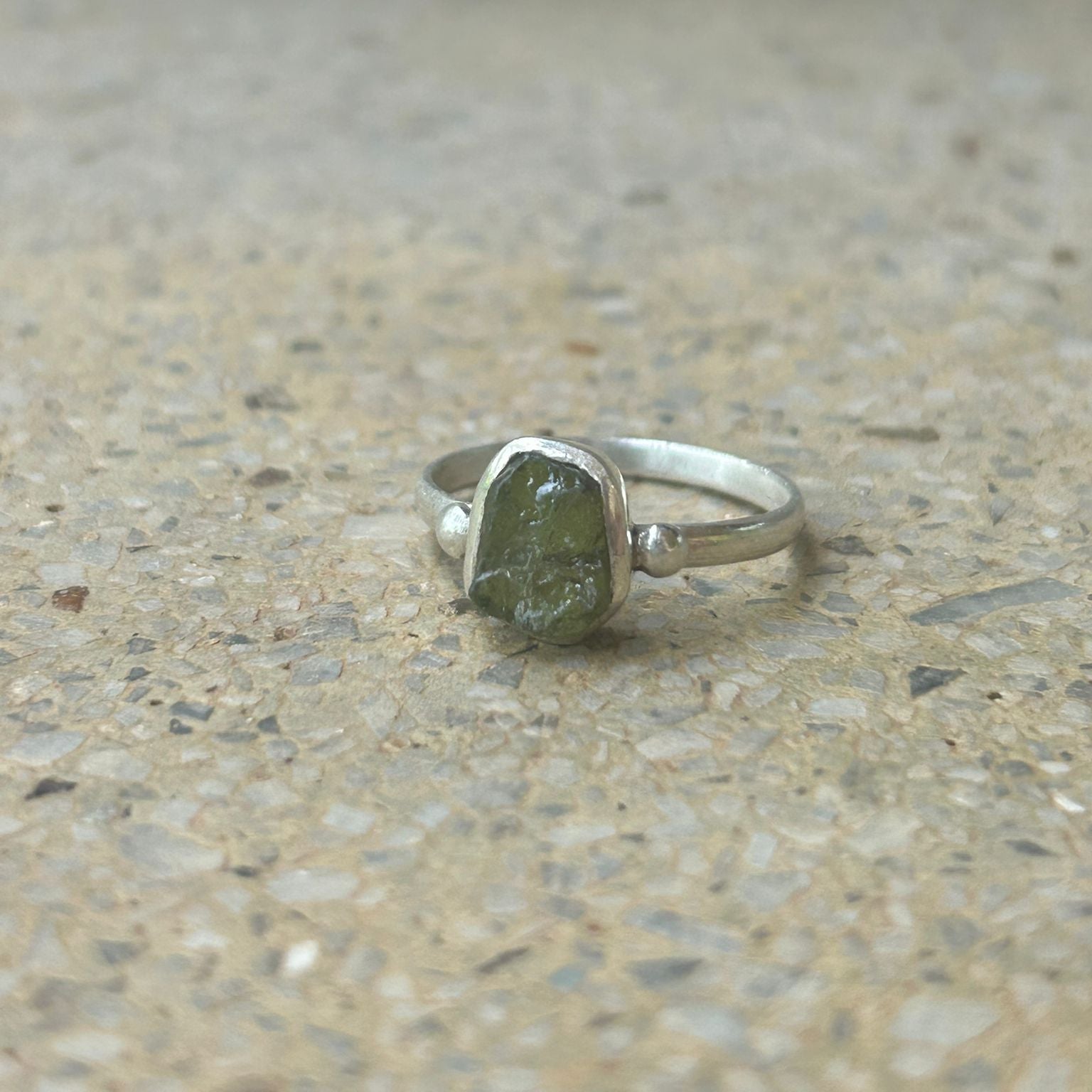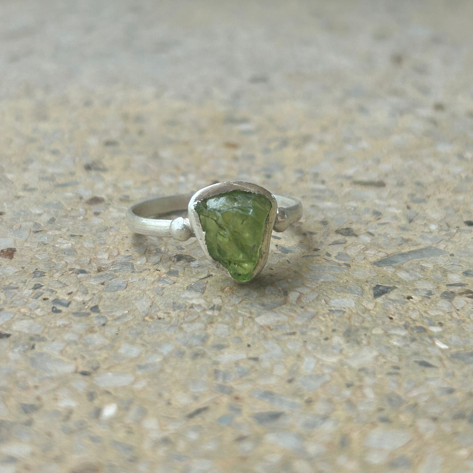 עשויה כסף סטרלינג 925 עם אבן פרידוט גולמית, ירוקה וזוהרת, שנשארה בדיוק כפי שהטבע יצר אותה.